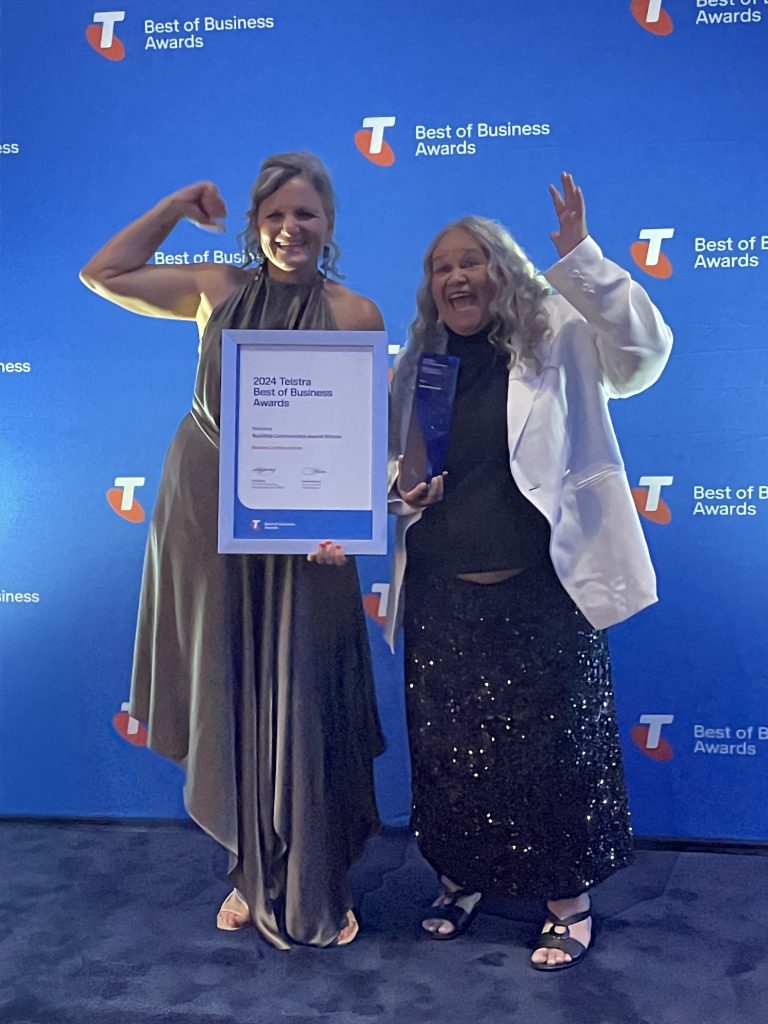 At the Telstra Best of Business Awards National Judging last week, our co-Directors, Aunty Munya Andrews and Carla Rogers, pitched live to the judges going up against an impressive array of fellow Building Communities State Winners, including Manapan Furniture, Accessible Homes Australia, and The Conversation.